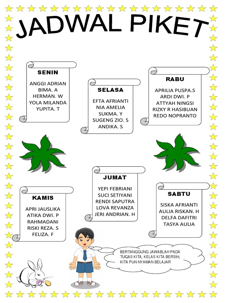 Hapus bagian yang tidak diperlukan, tambahkan bagian yang diinginkan. Dengan alat bantu jadwal pelajaran dari canva, anda dapat secara fleksibel membuat jadwal kelas yang mudah dimodifikasi sepenuhnya sesuai selera dan kebutuhan untuk tingkat sd, smp, mts, sma, smk hingga kursus online atau pembelajaran online. Contoh desain jadwal piket kelas. Itulah yang dapat kami bagikan terkait contoh gambar jadwal piket kelas yang unik. Banyaknya gambar superhero yang ditampilkan seperti spiderman captain amerika hulk dan ironman akan membuatnya semakin menarik. Desain untuk jadwal piket kelas dan susunan / struktur pengurus kelas. Pembuatan jadwal saat ini tidaklah terlalu sulit bahkan bisa dikerjakan dalam waktu yang cepat dengan bantuan software pembuat jadwal. Biasanya nih, kalau baru pertama masuk yang sudah mulai repot adalah bagian sekretaris kelas. Namun seringkali siswa yang ditugaskan untuk membuat jadwal piket kebingungan untuk membuatnya karena mereka ingin membuatnya jadwal piket yang tampak unik tetapi belum mahir. Gambar jadwal pelajaran yang unik tuesday september 4 1984 add comment edit. Cara membuat jadwal pelajaran dari karton, desain jadwal pelajaran kreatif, cara membuat jadwal pelajaran yang unik di microsoft word, cara membuat jadwal pelajaran yang bagus, contoh gambar jadwal piket kelas yang unik, cara membuat jadwal piket kelas yang kreatif, gambar jadwal pelajaran, cara membuat jadwal pelajaran di hp, cara membuat jadwal piket dari kertas karton dan origami, gambar. Cetak jadwal mata pelajaran/jadwal piket harga rp10.000/pcs bahan art carton 260 gr (merk pindo lux) ukuran a4 (21x29,7 cm) cetak full colour 1 sisi dengan menggunakan mesin digital print develop ineo 6000 Atau jika kalian ingin cara simpel maka bisa menggunakan template jadwal piket kelas yang bisa di unduh di situs yang menyediakan layanan template.